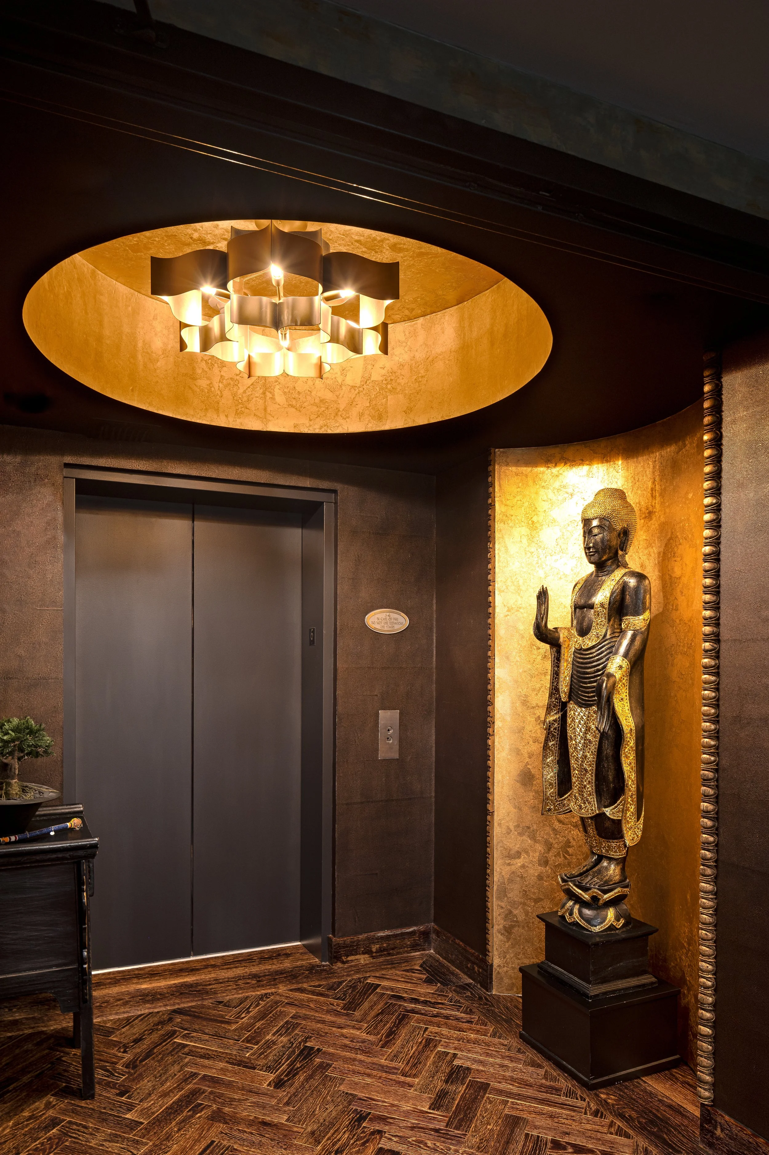 We lost a specialized flooring resource in Eastern Europe when Russia invaded Ukraine. A local vendor stepped in to work with us on providing a richly stained European oak floor with gold leaf pressed into the wire-brushed grain lines.