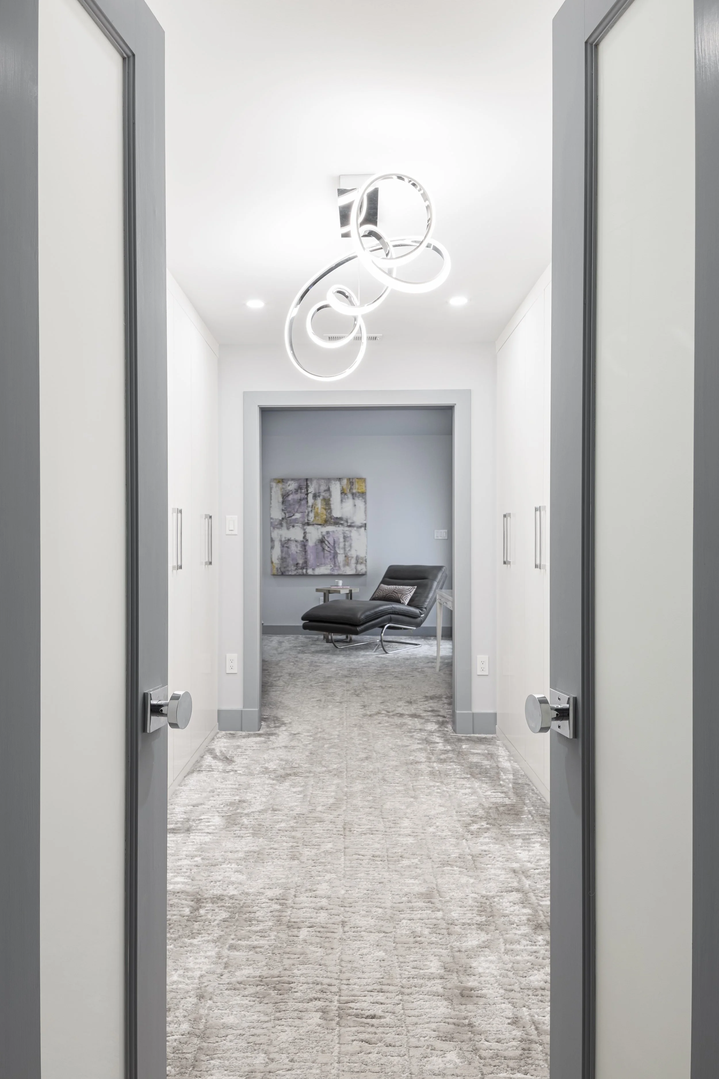 Fuzzy soft carpet is an ideal contrast to the glossy closet cabinets.