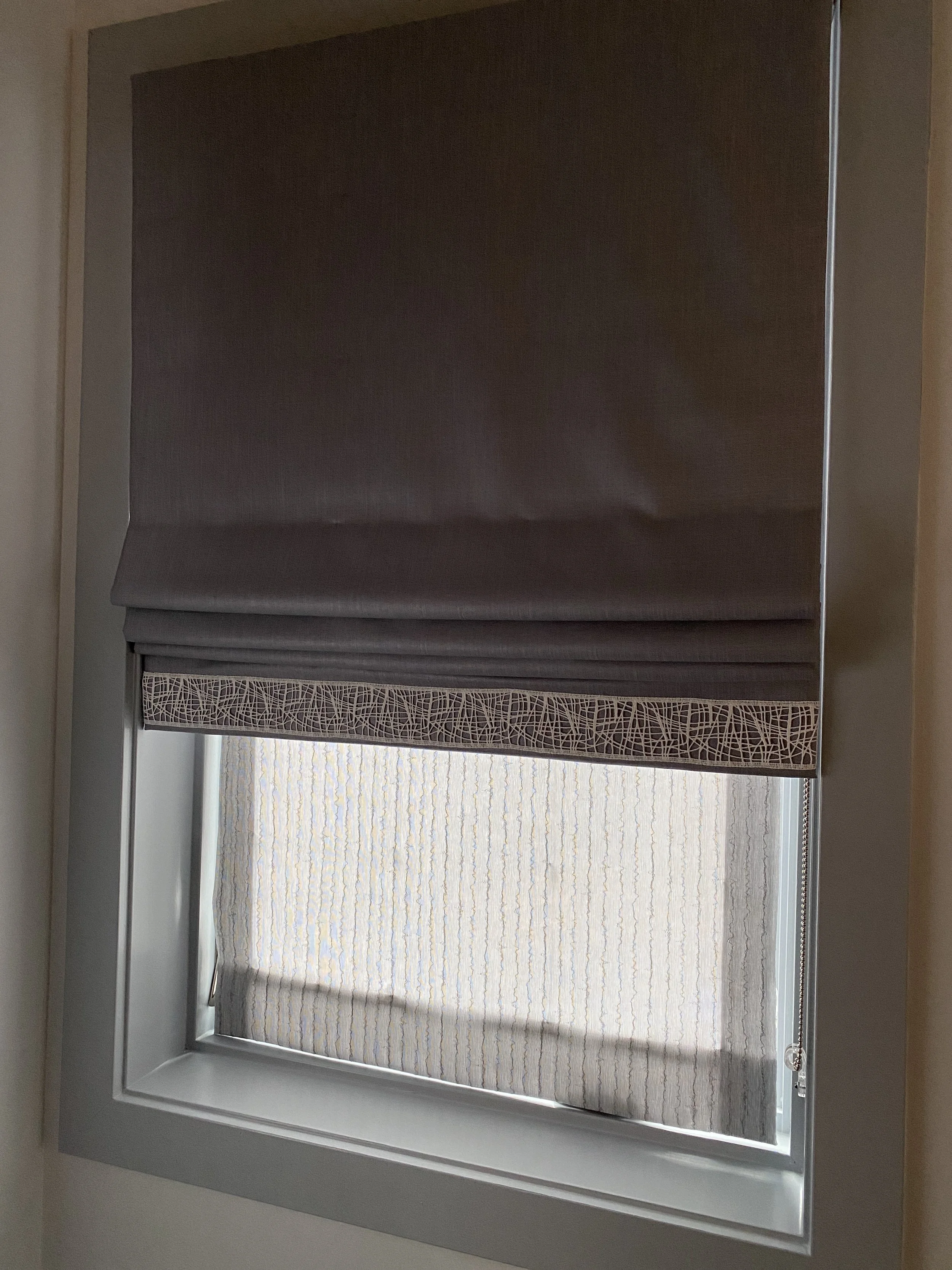 They’re great when you want a fabric window treatment, but can’t do curtains because of an obstruction (floor vent, radiator, limited wall space). This is actually a double shade treatment. A sheer fabric was used to provide privacy with sunlight, the top shade is total blackout. These really compliment the design of the room.